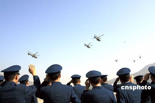 上午十時二十分,空軍六架直升機從石崗機場起飛,離開香港 。中新社發 張勤 攝
