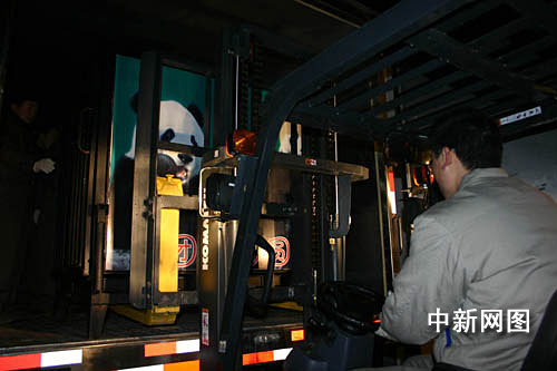 圖:工作人員將“團(tuán)團(tuán)”“圓圓”裝入運(yùn)輸車(chē)