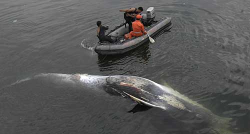 12月30日,菲律賓海岸警衛(wèi)隊(duì)在馬尼拉灣附近打撈起一具罕見(jiàn)的小須鯨尸體。這只重約2噸長(zhǎng)約10米的小須鯨的死因可能是與大型渡船相撞或者因?yàn)檠罅鞯淖兓月罚@是馬尼拉灣附近首次浮現(xiàn)鯨魚尸體。