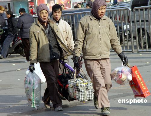 三位農民工剛從鄭州火車下車出站,準備返鄉過春節。