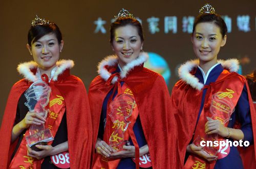 一月二十一日晚,臺灣籍空姐曾怡綸(中)奪得“深航女孩”總決賽冠軍,空姐常藝(左一)、魏禎(右一)分別獲得亞、季軍。