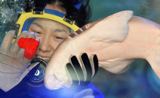 為迎接情人節到來,2月1日,日本首都東京的一個水族館,潛水員給鯊魚喂食紅心形的魚食。這一充滿浪漫情調的喂食活動將持續兩周。