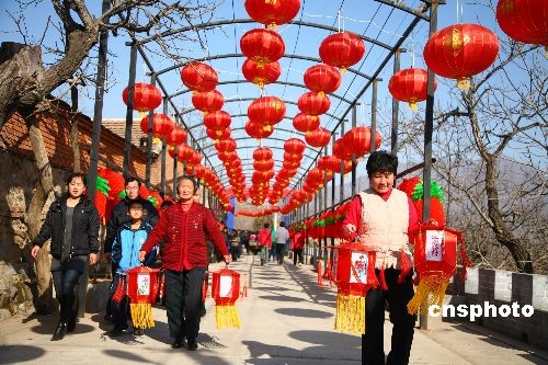 2月9日,紅廟村紅燈籠走廊。當日,北京市懷柔區紅廟村隆重舉辦“北京九渡河首屆元宵燈會”,從入村路口到進村街道直至村內的大小巷道,萬盞花燈,營造出一片燈的海洋。