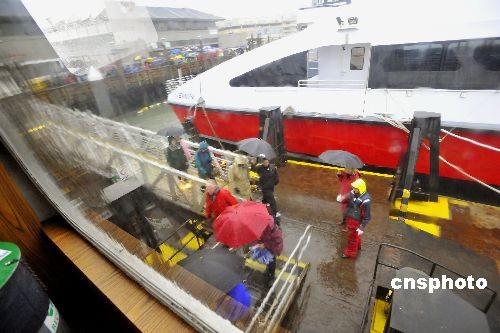 圖為民眾冒雨從舊金山登船前往天使島。中新社發(fā) 陳鋼 攝
