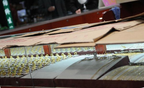 當(dāng)營業(yè)員招呼“顧客”時(shí),四名嫌疑人瞅準(zhǔn)時(shí)機(jī),迅速地將柜臺上的玻璃掀起,伸手將柜臺里的黃金手鏈、項(xiàng)鏈拿出裝入隨身帶的白色包內(nèi)。四人得手后迅速溜走。
