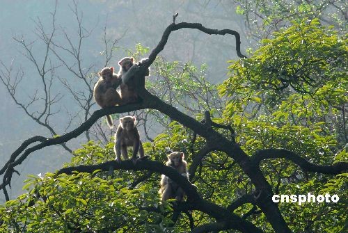 2009年2月21日,貴陽陽光明媚,黔靈公園里的猴子們吃飽喝足后,扒上高高大樹享受春光。中新社發 張天林 攝