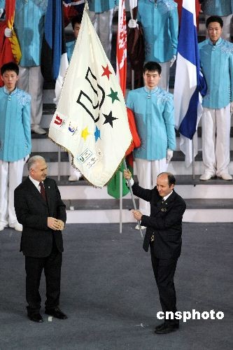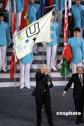 國際大體聯會旗被轉交到下屆大冬會主辦城市——土耳其埃爾祖魯姆市代表手中。中新社發 姚庭山 攝