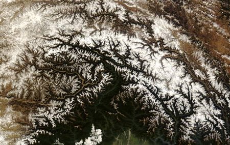 青藏高原冬季衛星圖:NASA土地衛星上高清代分光成象儀(MODIS)拍攝到了青藏高原的真彩圖片,可以看到被稱為"世界屋脊"的高原上,山頂的點點積雪和部分結冰的湖面。