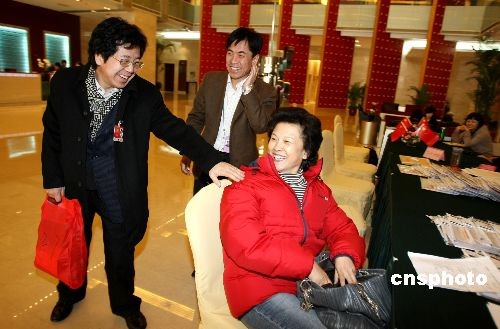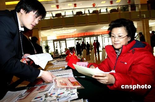 3月2日,參加全國政協十一屆二次會議的全國政協委員陸續向大會報到。圖為著名演員宋春麗在報到處領取會議材料。中新社發 傅丹丹 攝