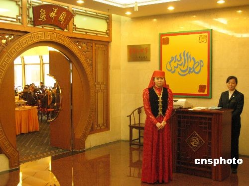 3月2日,在全國政協委員入駐的北京友誼賓館,服務員穿起民族服裝,迎接參加會議的委員到伊斯蘭餐廳用餐。中新社發 張子揚 攝