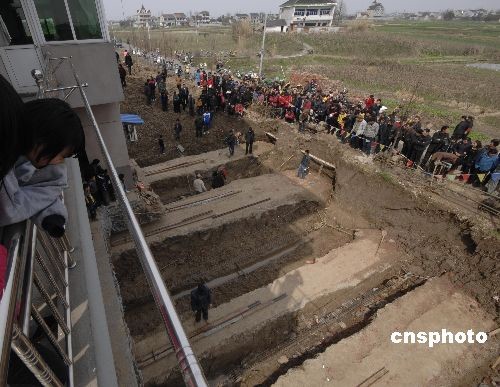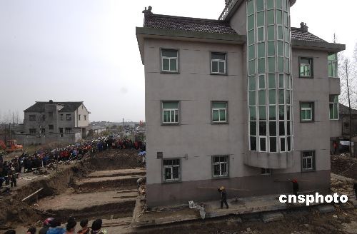 3月8日,浙江省嘉興市秀洲區王店鎮假山村村民徐小觀家1700多噸重的三層別墅開始整體平移,吸引眾多村民前來觀看。由于嘉紹高速(嘉興至紹興)的建設需要,這棟樓房需由北向南平移15米,通過樓房整體平移取得了“三方共贏”的效果——不僅為修路讓出了道,為順利動遷節省了成本,而且也為自己節省了至少20萬元的重建費用。同時在“移動”的樓里正常生活絲毫不受影響。中新社發 儲永志 攝