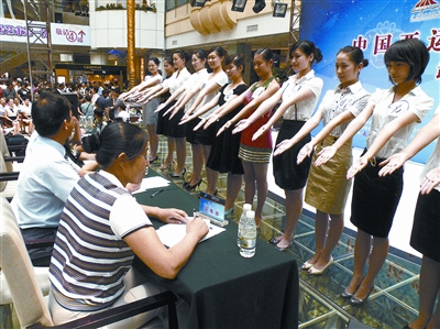 “請把劉海撥開”、“把小腿露出來”、“上前一步伸出雙手”、“請繞場一圈”……12日,“2009年中國亞運空姐招募大匯”武漢賽區(qū),面試全部結束,5位專業(yè)評委嚴格按照標準篩選,1022名佳麗僅有542人拿到通行證,晉級下一輪。