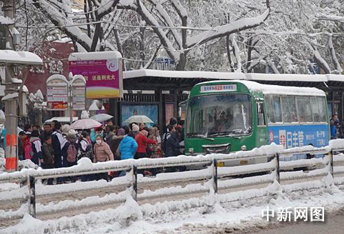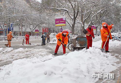 11日下午,在山西太原市街頭,一片銀裝素裹。街頭兩旁一些樹枝被大雪壓斷,受暴雪的影響街道上行駛的車輛明顯減少,一些環衛工人正在緊急清掃路面上的積雪,居民出行只能選擇步行或乘坐公交汽車。攝影:張雷杰