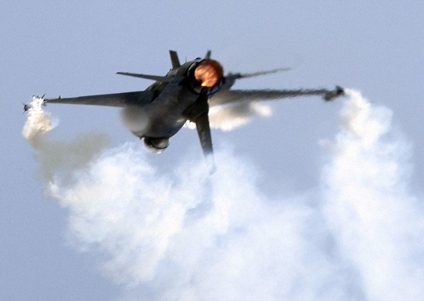 圖為美國F-16戰(zhàn)斗機(jī)進(jìn)行飛行表演。