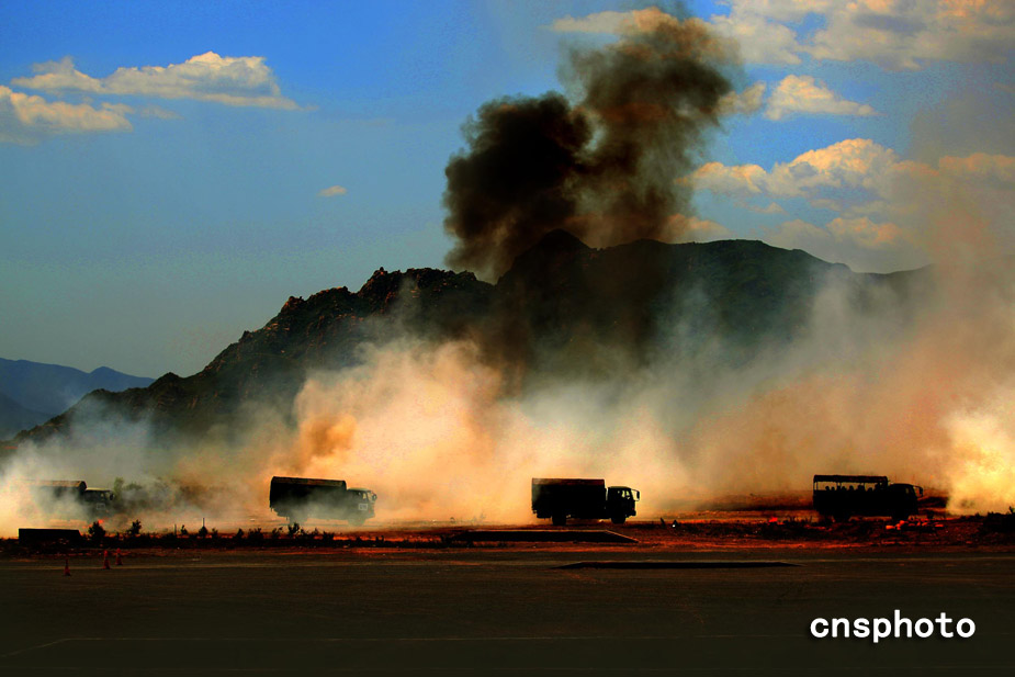 圖為運輸車隊火速突破炮火封鎖線。