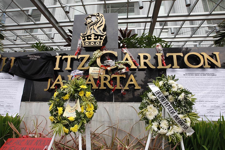 7月18日,印度尼西亞首都雅加達的民眾紛紛來到發生爆炸的萬豪酒店和麗嘉酒店,向死難者獻花表示哀悼。