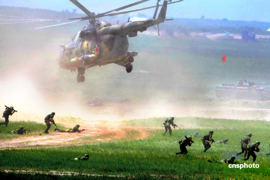 中國、俄羅斯兩軍總參謀長,7月23日上午到沈陽軍區(qū)洮南合同戰(zhàn)術訓練基地,觀看“和平使命2009”聯(lián)合反恐軍事演習。雙方以陸軍和空軍為主,中方參演部隊包括1個陸軍戰(zhàn)斗群和1個空軍戰(zhàn)斗群。俄方參演兵力包括1個陸軍加強摩步營、1個空降突擊連和部分空軍兵力,雙方投入兵力兩千多人。中新社發(fā) 宋吉河 攝
