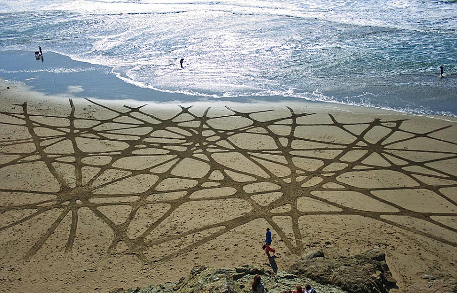 據英國媒體7月27日報道,藝術家Andres Amador用耙子在沙灘上作畫,眾多中心對稱的幾何圖形,不在乎是否能長久保留,但求被海浪帶走前與大自然的完美融合。