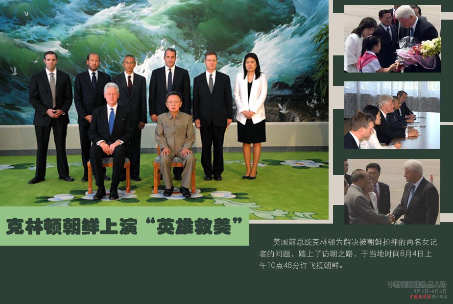 中新網本周熱點人物之克林頓——8月6日,美國前總統克林頓在平壤斡旋成功,朝鮮領導人金正日下令特赦在押的兩名美國女記者。三十二歲的凌志美、三十六歲的李承恩(前譯李尤娜)與克林頓所乘坐的飛機在洛杉磯附近的伯班克機場降落,兩名女記者下機時,與家人團聚激動得泣不成聲。