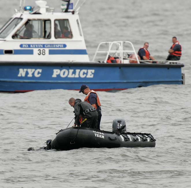 8月8日,紐約市曼哈頓西側的哈德遜河上空,一架觀光直升飛機和一架小型飛機相撞,兩飛機雙雙墜入河中。據稱觀光直升飛機上載有五名意大利游客和一名飛行員,而小型飛機上則有三人。圖為工作人員在現場救援。