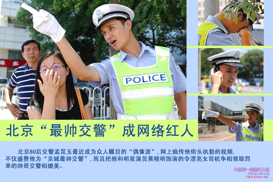 中新網(wǎng)本周熱點人物之最帥交警——1981年出生的孟昆玉因兢兢業(yè)業(yè)地在崗位上奉獻(xiàn)八年,公正執(zhí)法、悉心為民服務(wù)。被網(wǎng)友捧為“北京最帥交警”。