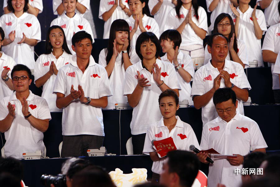 “跨越海峽的愛心”——大陸同胞援助臺灣“莫拉克”臺風受災同胞賑災晚會在北京舉行。眾多文體界明星在現場亮相。圖為郎平、孫海平、仲滿等亮相賑災晚會。中新社發 杜洋 攝