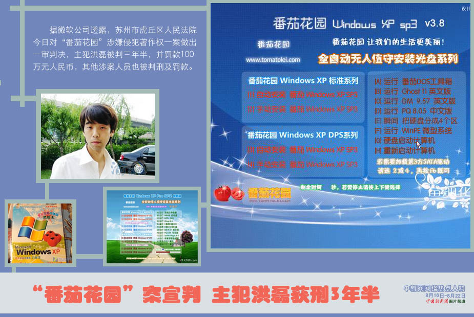 中新網本周熱點人物之——洪磊 微軟公司透露,蘇州市虎丘區人民法院今日對“番茄花園”涉嫌侵犯著作權一案做出一審判決,主犯洪磊被判三年半,并罰款100萬元人民幣,其他涉案人員也被判刑及罰款。