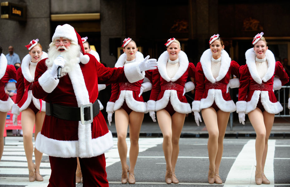 8月25日,美國“火箭女郎”舞蹈團身著圣誕裝在無線電城音樂廳(Radio City Music Hall)前演出。來源:中國新聞網