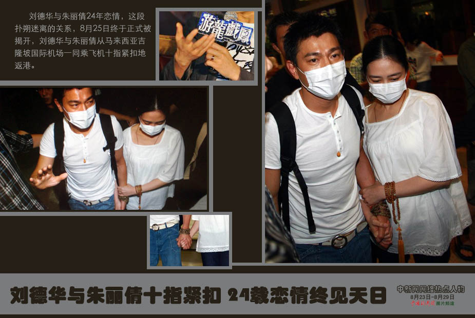中新網本周熱點人物之——劉德華與朱麗倩  劉德華與朱麗倩24年戀情,這段撲朔迷離的關系,8月25日終于正式被揭開,兩人繼日前結伴到岳父墓前拜祭后,劉德華與朱麗倩從馬來西亞吉隆坡國際機場一同乘飛機十指緊扣地返港。