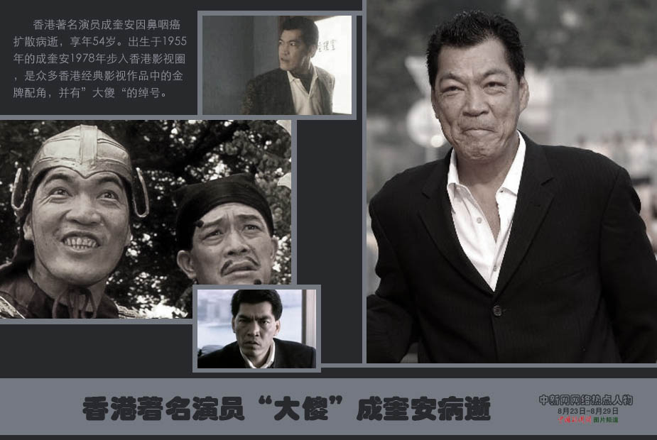中新網本周熱點人物之——成奎安  北京時間27日晚23時45分,香港著名演員成奎安因鼻咽癌擴散病逝,享年54歲。出生于1955年的成奎安1978年步入香港影視圈,是眾多香港經典影視作品中的金牌配角,并有”大傻“的綽號。