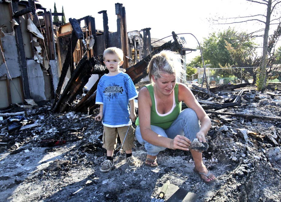 加州消防部門表示,火勢在一夜之間幾乎擴散了一倍,如今五個鎮共計一點四萬公頃茂盛的灌木叢著火,波及拉克利仙塔至拉加尼達弗林楚奇之間十九公里的范圍。圖為受災的民眾在被燒毀的家園尋找個人物品。