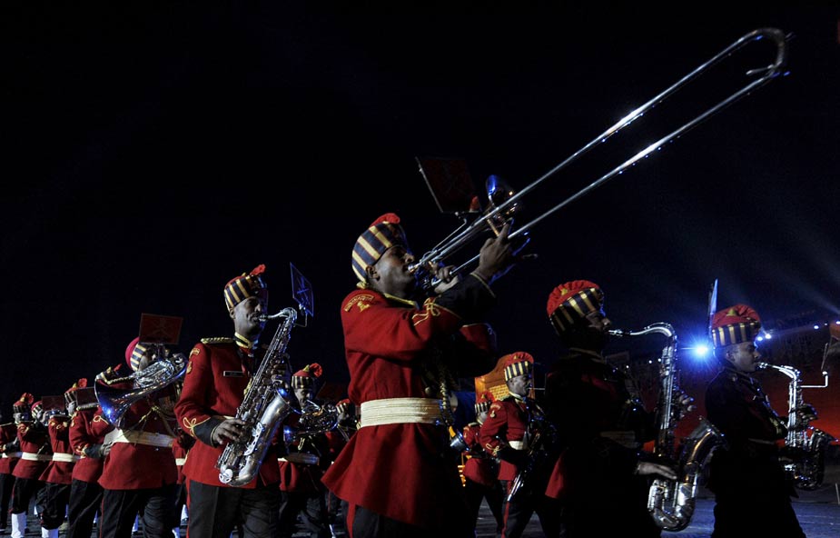 9月4日晚,俄羅斯莫斯科紅場舉行了俄羅斯國際軍樂節開幕前夕的總彩排。首屆俄羅斯國際軍樂節將于9月5日至10日在莫斯科紅場舉行。圖為印度軍樂團正在進行彩排。