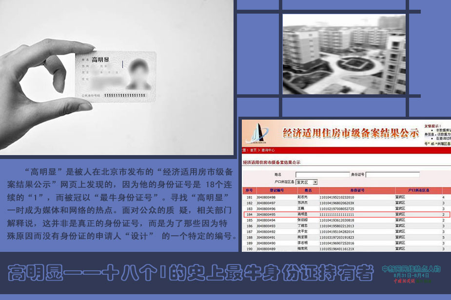 中新網本周熱點人物之——高明顯 “高明顯”是被人在北京市發布的“經濟適用房市級備案結果公示”網頁上發現的,因為他的身份證號是 18個連續的“1”,而被冠以“最牛身份證號”。尋找“高明顯”一時成為媒體和網絡的熱點。面對公眾的質 疑,相關部門解釋說,這并非是真正的身份證號,而是為了那些因為特殊原因而沒有身份證的申請人“設計” 的一個特定的編號。圖片來源:中青網、人民網、大河網