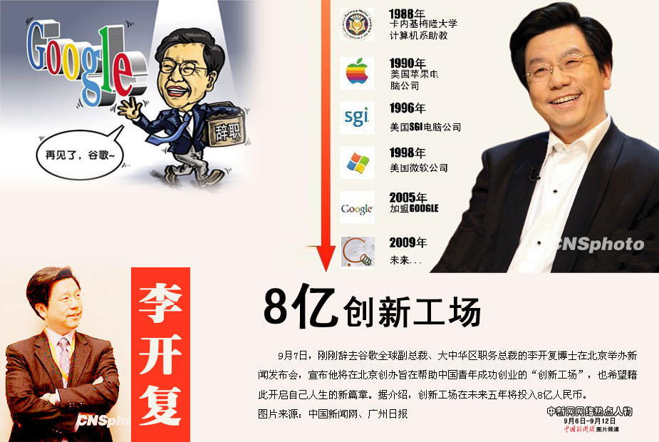 中新網(wǎng)本周熱點(diǎn)人物之——李開復(fù) 剛剛辭去谷歌全球副總裁、大中華區(qū)職務(wù)總裁的李開復(fù)博士在北京舉辦新聞發(fā)布會(huì),宣布他將在北京創(chuàng)辦旨在幫助中國(guó)青年成功創(chuàng)業(yè)的“創(chuàng)新工場(chǎng)”,也希望藉此開啟自己人生的新篇章。據(jù)介紹,創(chuàng)新工場(chǎng)在未來(lái)五年將投入8億人民幣。