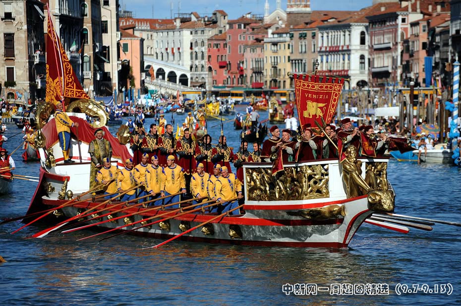 9月7日,意大利威尼斯舉行一年一度的傳統賽舟會,選手們身著傳統服裝,參加這項古老的集賽舟和傳統服裝展示為一體的競技項目。圖片來源:中國新聞網