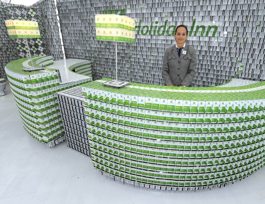 9月17日,在美國紐約,一位名叫布賴恩的設計師展示他利用房門卡設計的客房。這個占地約37平方米的酒店接待大廳、臥室和衛生間是利用20多萬張房門卡搭建而成的。