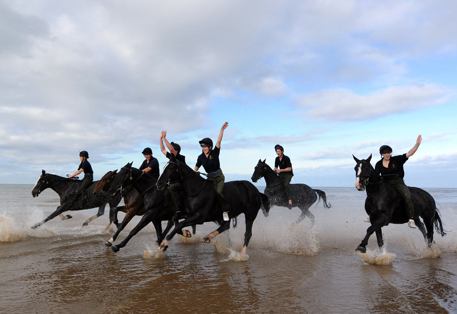 9月16日,英國皇家騎兵團在英格蘭黑池附近的海水中暢游。在日常儀式職責之余,騎兵團帶著馬匹來這里放松休息。圖片來源:中國新聞網