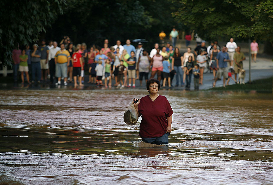 22日,洪水襲擊美國喬治亞洲,一位婦女為了趕去工作,毫不猶豫地趟過被洪水淹沒的街道。圖片來源:中國新聞網