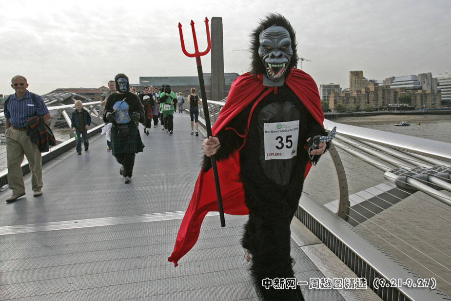 9月26日,一年一度的“大猩猩賽跑”在英國倫敦街頭舉行,人們紛紛打扮成大猩猩的模樣參加賽跑。圖片來源:中國新聞網
