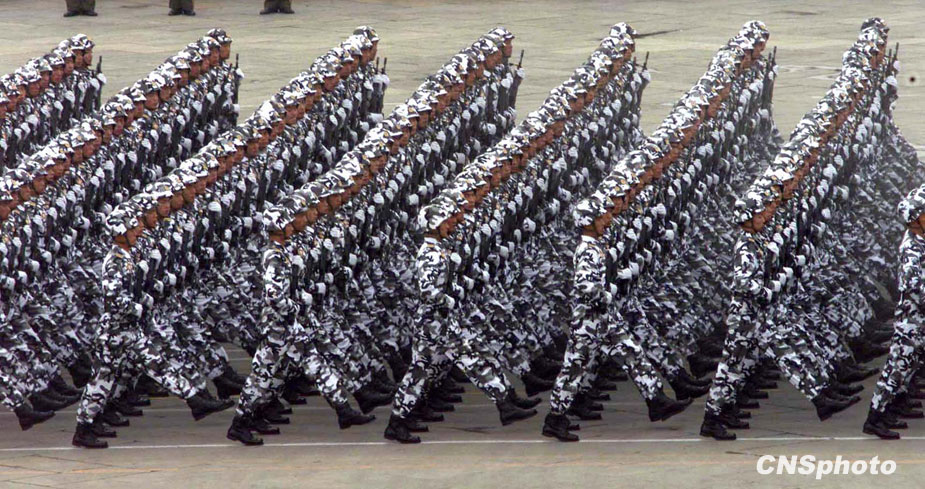 圖為1999年國慶閱兵式上海軍陸戰隊方隊從天安門前走過。中新社發 李剛 攝