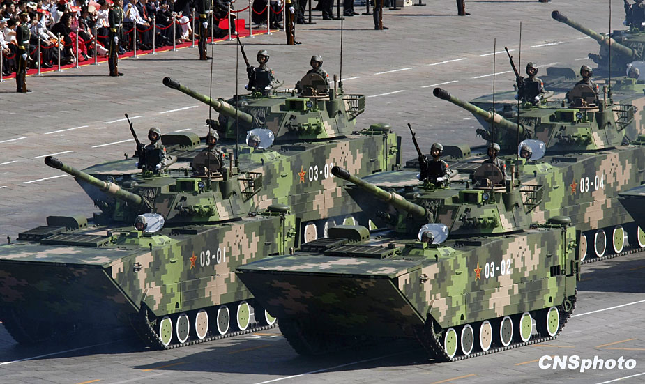 2009年10月1日,中華人民共和國成立60周年慶祝大會(huì)在北京天安門廣場舉行。圖為兩棲突擊車方隊(duì)。中新社發(fā) 趙振清 攝