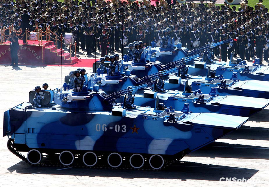 10月1日,中華人民共和國成立60周年慶祝大會在北京天安門地區及長安街沿線舉行。圖為海軍05式兩棲步戰車方隊通過天安門廣場。首次亮相的05式兩棲步戰車是海軍陸戰隊新一代主戰裝備,信息化程度較高,安裝了先進的火控系統、衛星定位系統、夜視系統、一體化通訊系統等。同時,步戰車火力系統得到全面提升,裝備了反坦克導彈、速射炮和高射機槍,能有效應對來自坦克和直升機的威脅。中新社發 任晨鳴 攝