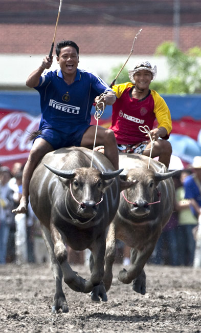 10月3日,泰國一年一度的騎水牛大賽在春武里舉行。