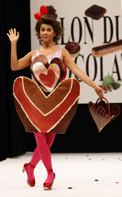 10月13日,第15屆法國巴黎巧克力展開幕,眾多明星身著巧克力服飾亮相。圖片來源:中國新聞網