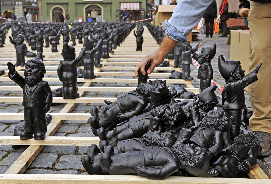10月14日,德國施特勞賓市街頭擺放了1250個行納粹禮的花園土地神像,“行納粹禮的花園土地神”其實(shí)是一款雕塑作品,是由59歲的德國藝術(shù)家奧特馬爾·赫勒爾創(chuàng)作的目的在于提醒人們警惕法西斯思想,反對使用法西斯思想控制大眾。