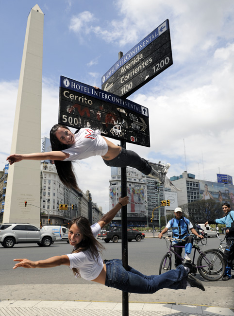 10月19日,阿根廷布宜諾斯艾利斯市街頭,鋼管舞小姐在街頭表演,路邊的路燈、電線桿變身為鋼管舞道具。圖片來源:中國新聞網