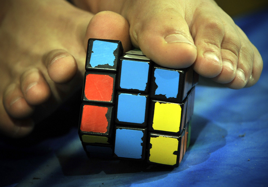 圖為一名參賽者在用腳玩轉魔方。10月18日,匈牙利魔方大賽在首都布達佩斯舉行,各路魔方高手展開對決。圖片來源:中國新聞網