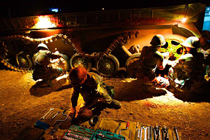 當晚國防大學防務學院、空軍指揮學院的外軍學員,以及英國、以色列、土耳其、巴基斯坦等國軍事觀察員親臨現場觀摩了后勤保障戰斗準備、自行榴彈炮占領陣地、裝甲車輛“摸黑”開進等戰斗要素。圖為戰地搶修裝甲戰車。中新社發 宋吉河 攝