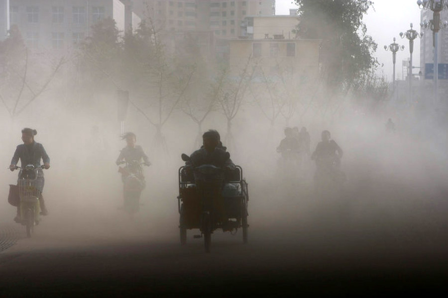 周日(18日), 河北石家莊,中華大街與裕華路交口,自行車在大風(fēng)引起的揚(yáng)塵中艱難前行。10月18日起,北方迎來大幅降溫,部分地區(qū)風(fēng)力將達(dá)8級(jí)。 阿拉爾 攝