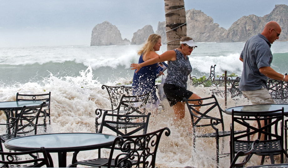 當地時間10月19日,墨西哥圣盧卡斯角,颶風里克已經在墨西哥沿海升級為10年來威力最強的颶風。圖為游客被海邊的巨浪趕跑。